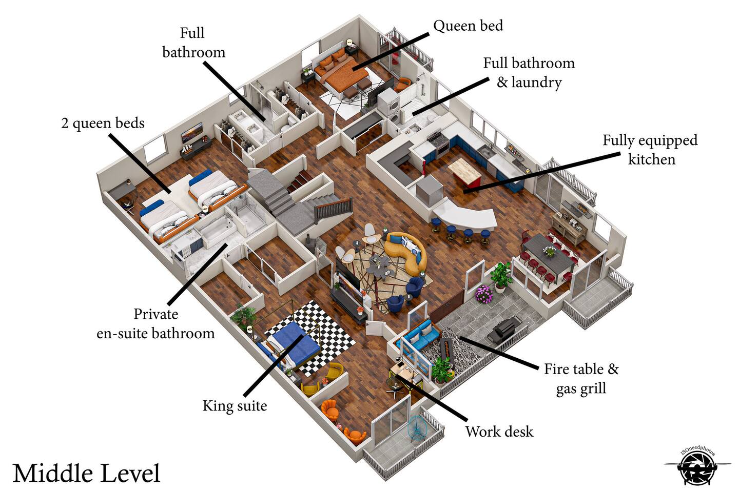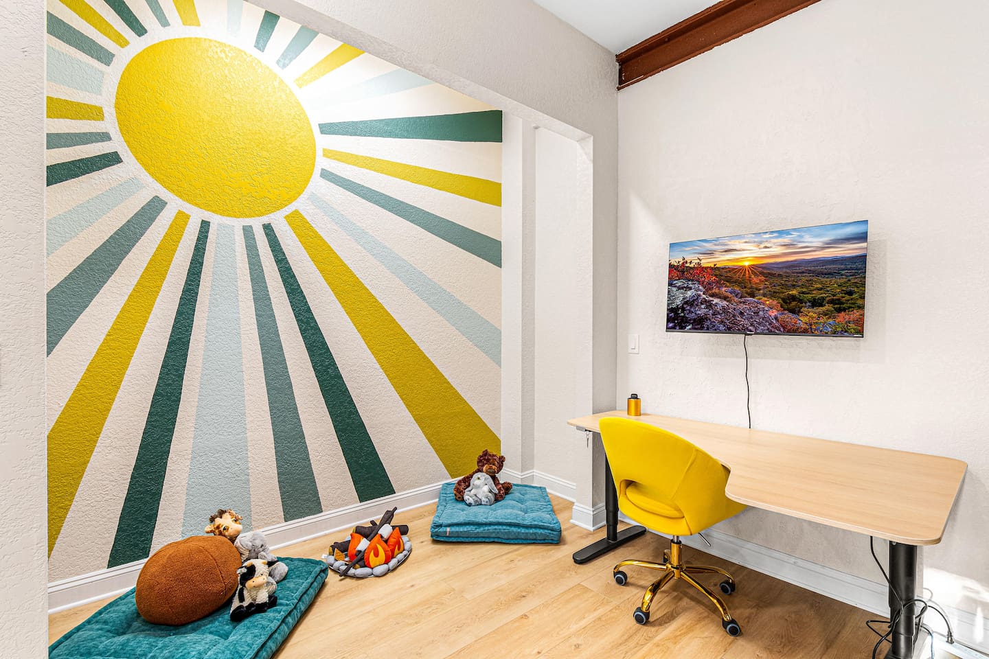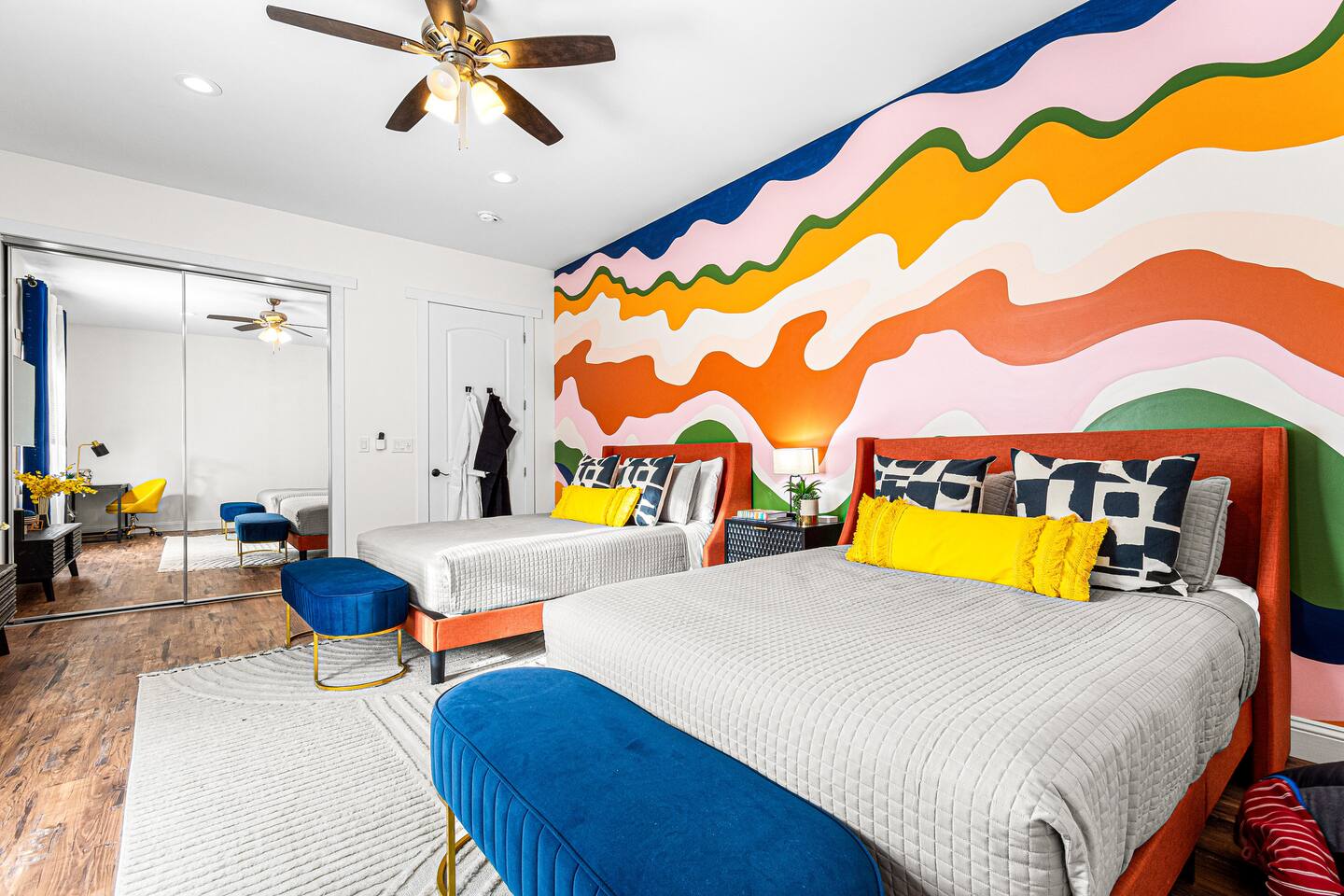 The largest guest bedroom is fitted with 2 queen beds, and an inspirational custom mural, while a smart TV offers entertainment at your fingertips!