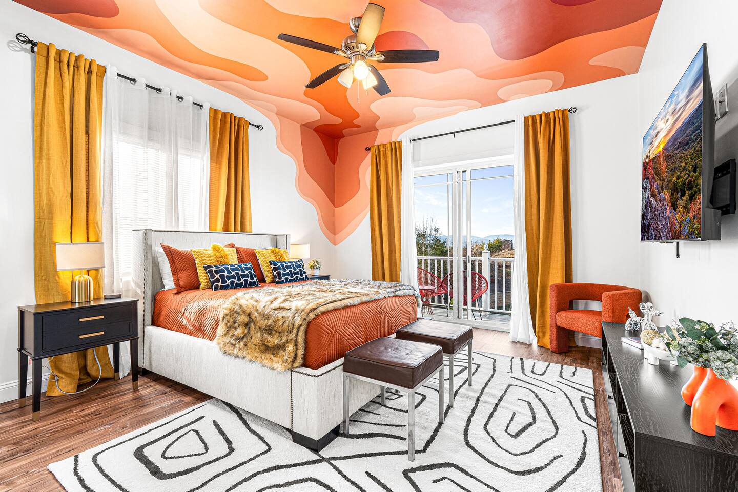 The 2nd guest bedroom on main floor is fitted with a queen bed, an amazing custom mural, beautiful mountain views with a deck to take in the air and a smart TV!
