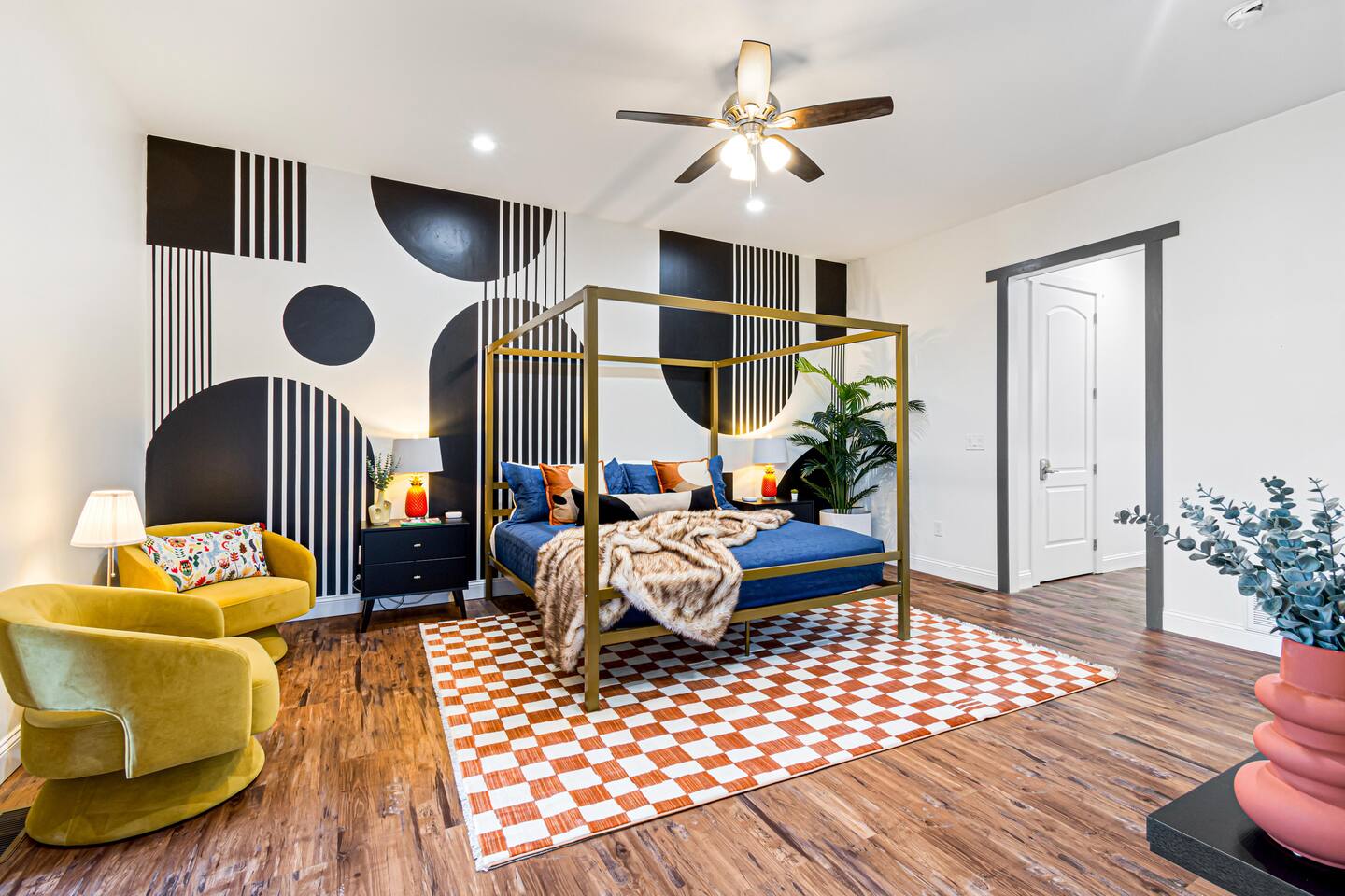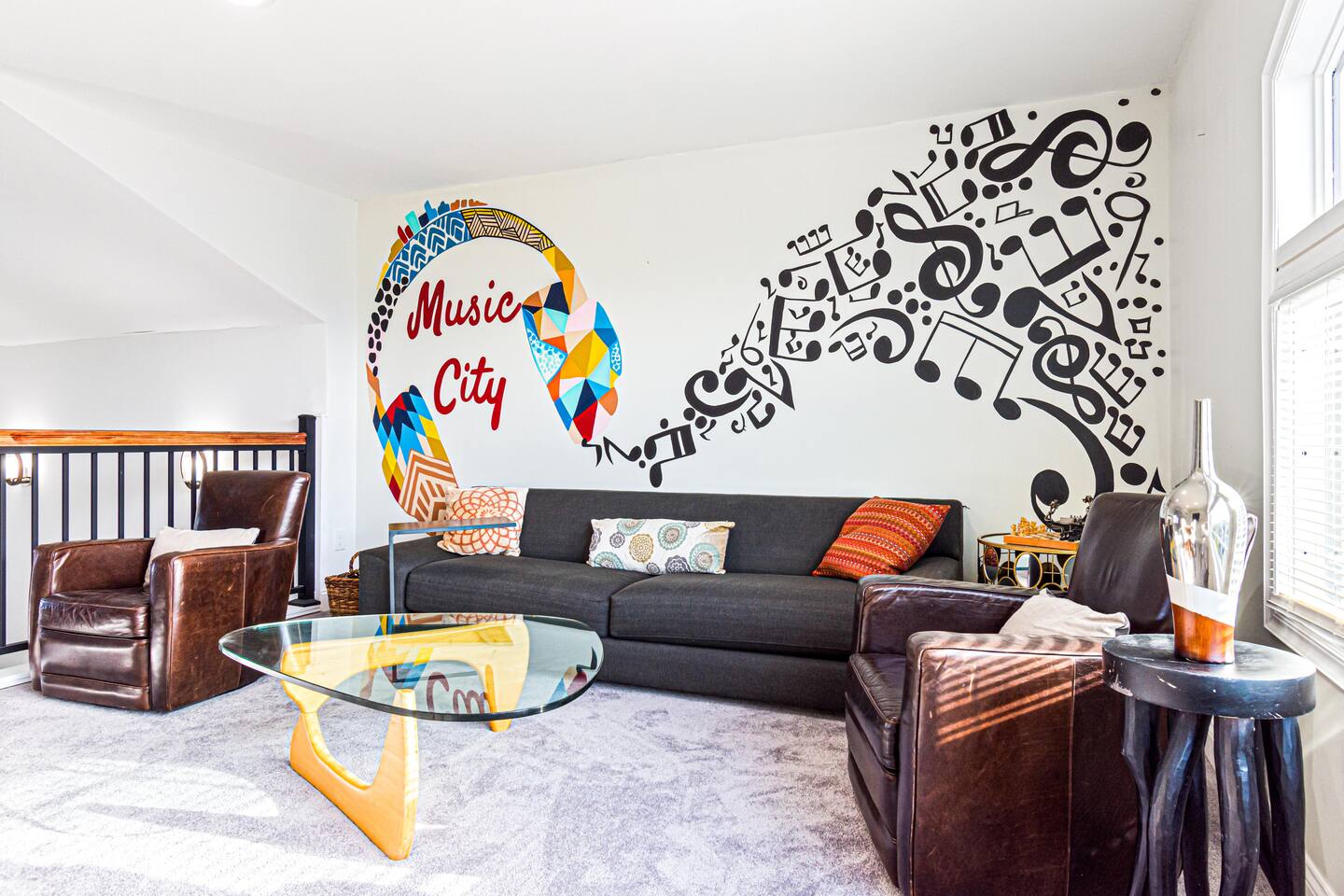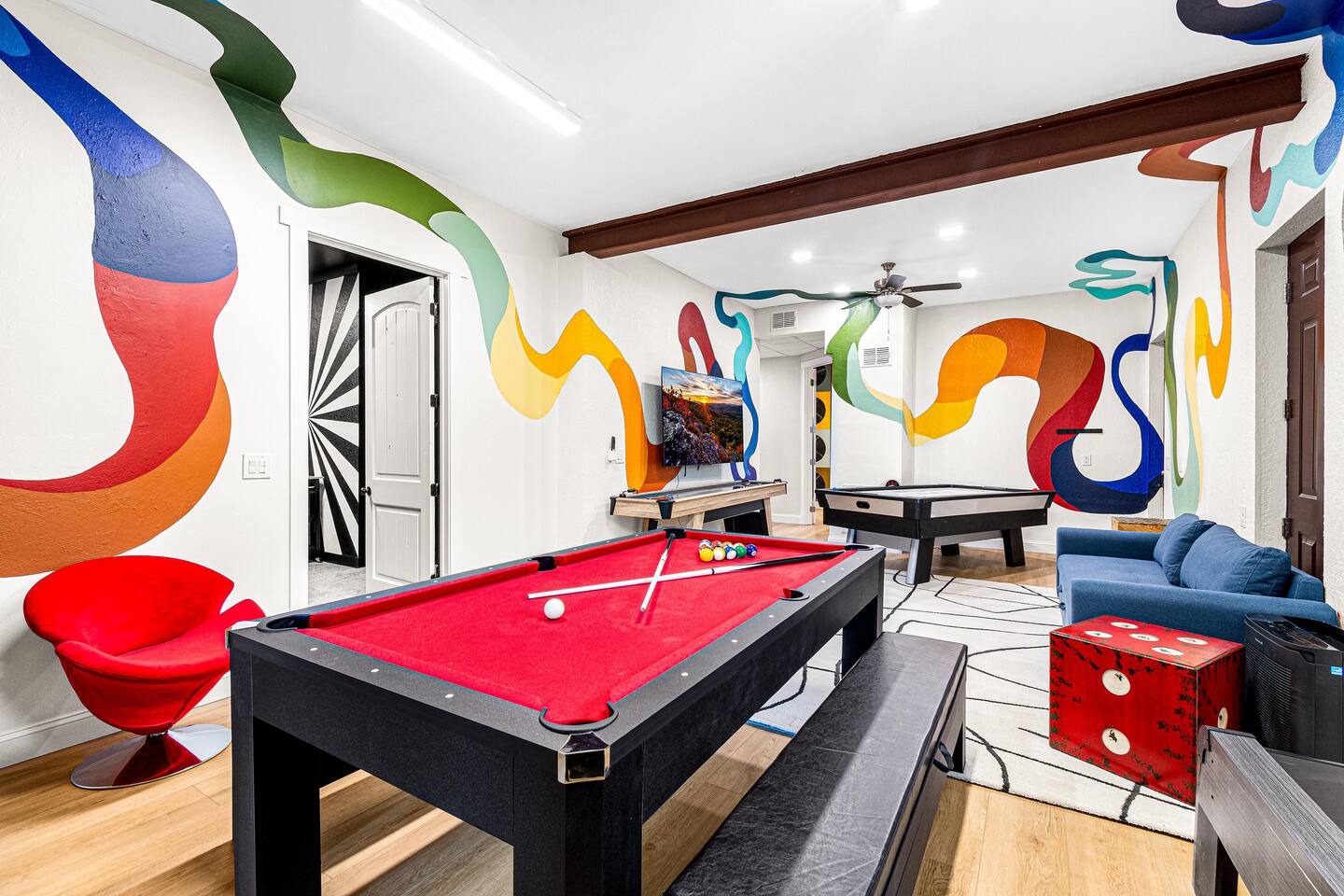 Cozy up in the fifth guest bedroom with a king bed and a groovy musical mural, walk-in open closet, and smart TV!