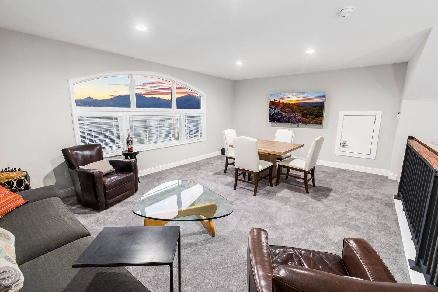 In the living room, sink into the plush comfort of a large sofa and accompanying chairs, all strategically positioned around the TV mounted in front of the striking floor-to-ceiling custom mural. This inviting space invites relaxation and camaraderie, ensuring memorable moments during your stay at the Alpine Artistry Estate.