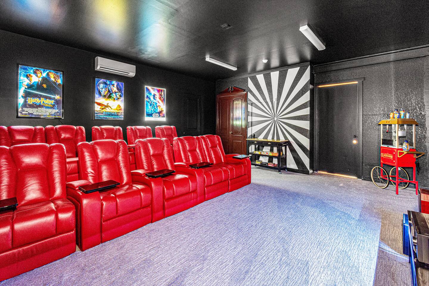 ☀ Luxurious Home Theater: 10 cushy leather recliners, backlit movie posters