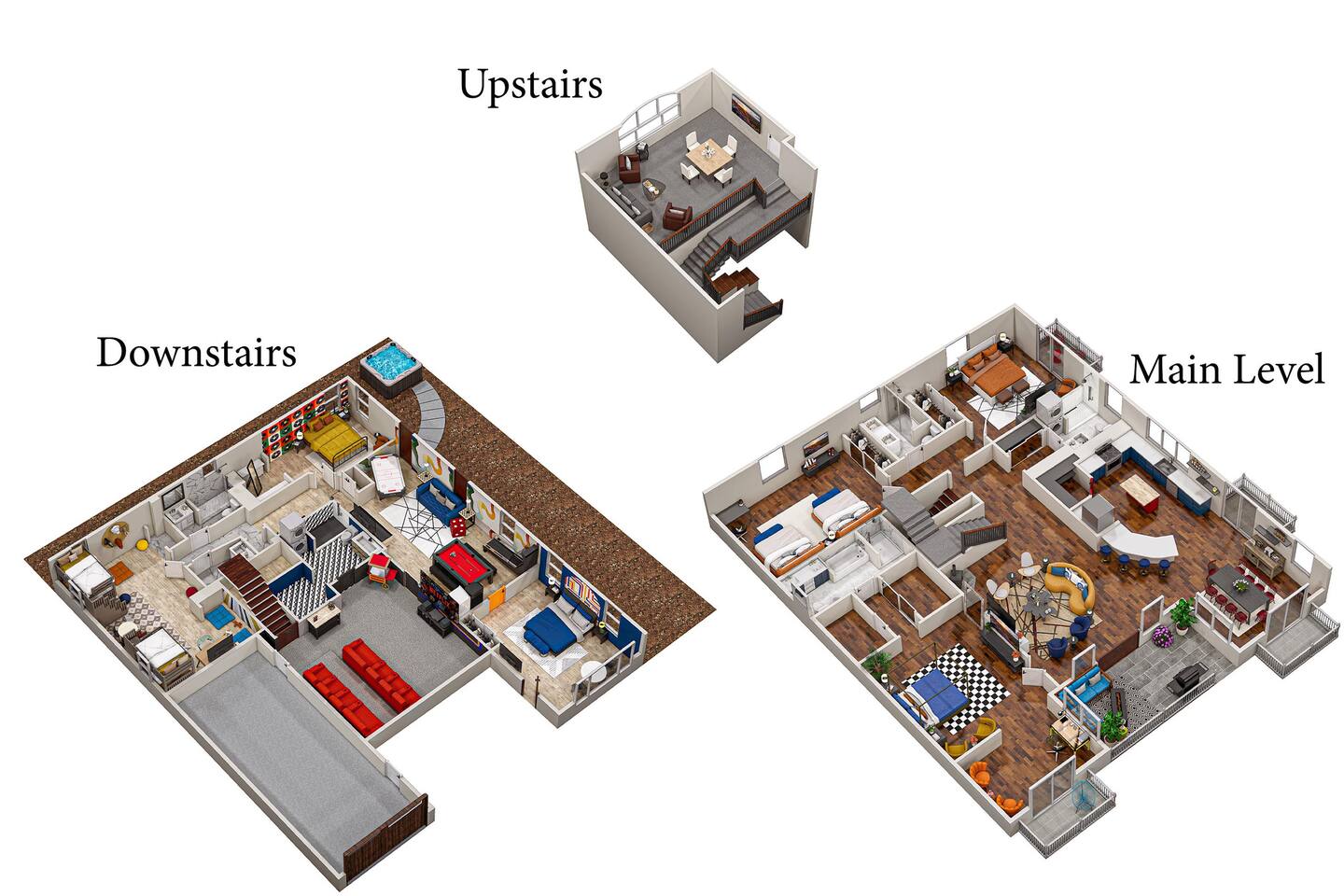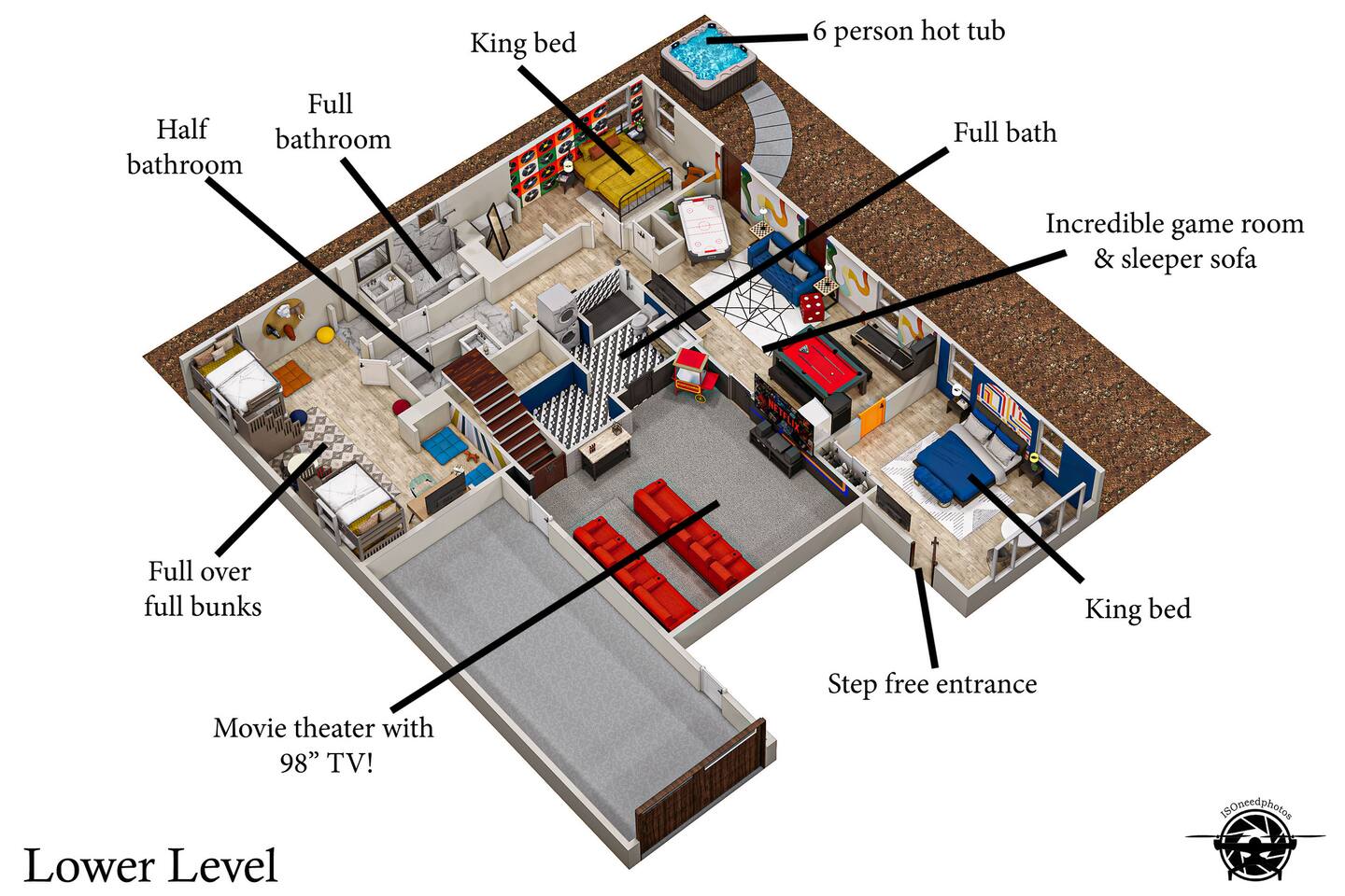 Downstairs, guests will find an additional 2 full bathrooms guaranteeing optimal privacy and comfort. Further, there is a small half bath next to the bunk bed room for additional options.
